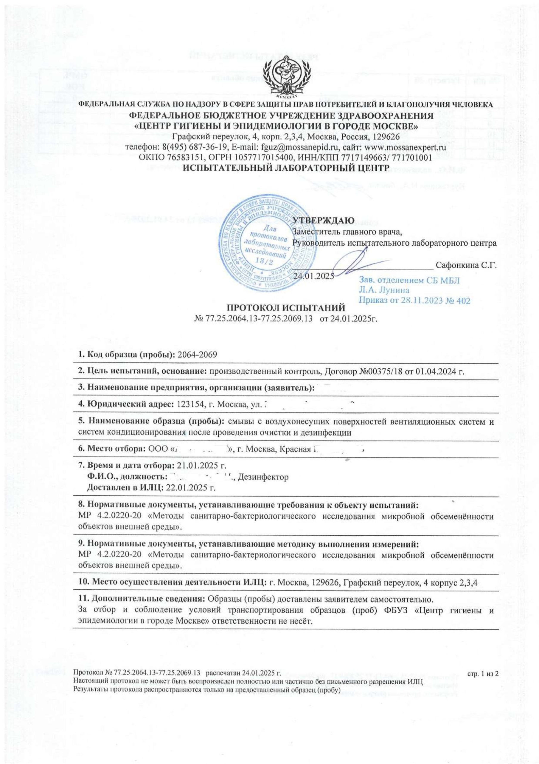 Для проверки качества дезинфекции, по запросу заказчика, берутся смывы с внутренних поверхностей систем вентиляции. Точки отбора смывов и их количество определяет заказчик. Анализы смывов проводятся в лаборатории Роспотребнадзора. По результатам Заказчику передаётся протокол исследований смывов.