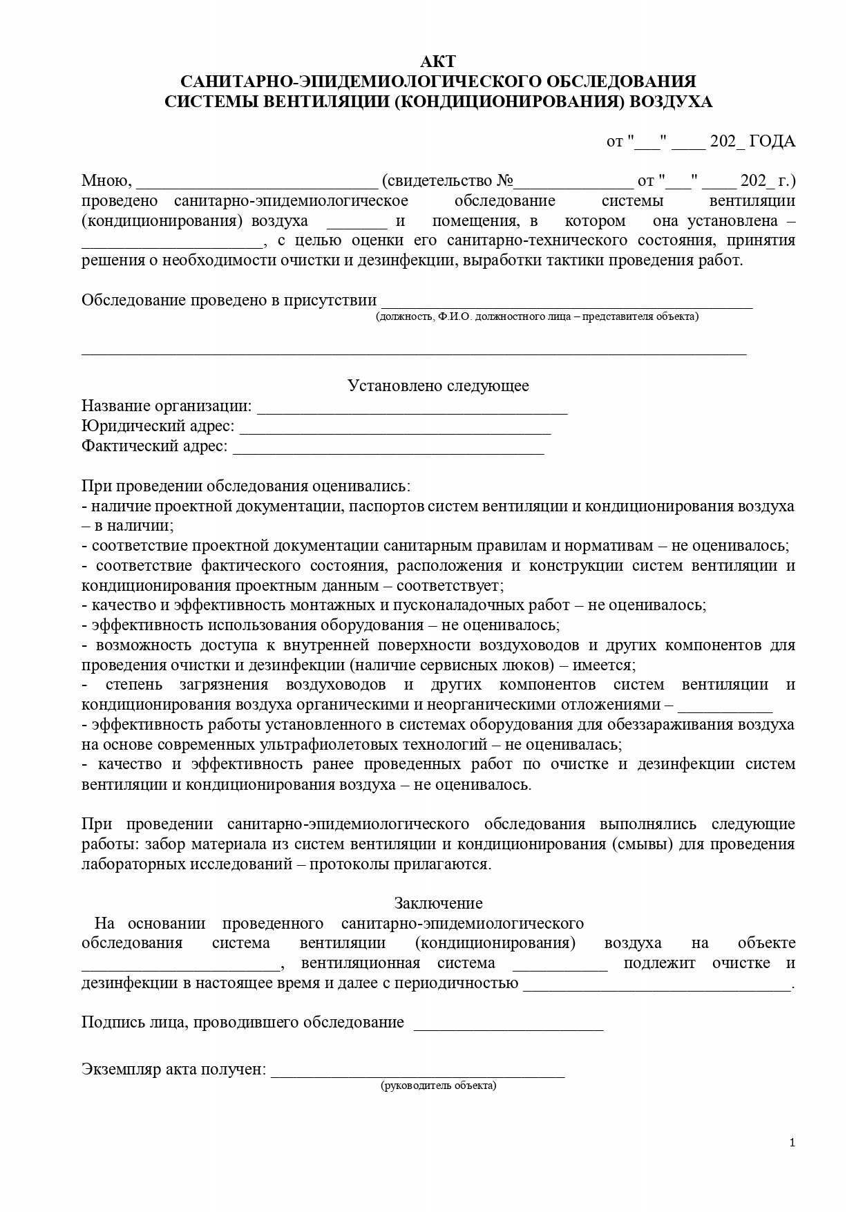 Для успешного прохождения проверок Роспотребнадзора, мы предоставляем полный пакет документов для проверяющих органов: договор на производство работ по дезинфекции систем вентиляции, акт сдачи-приёма выполненных работ, лицензию на дезинфекционную деятельность, сертификаты на дезинфицирующие средства, паспорт безопасности дез. средства, сертификат соответствия дез. средства, протоколы лабораторных исследований смывов (при необходимости), акт санитарно-эпидемиологического обследования (при необходимости).
